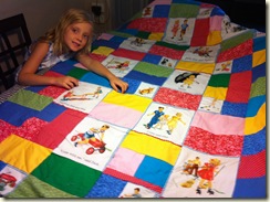 Here’s the layout for my daughter's quilt, and then sewn together waiting for quilting – using the “Dick and Jane” fabric panel.